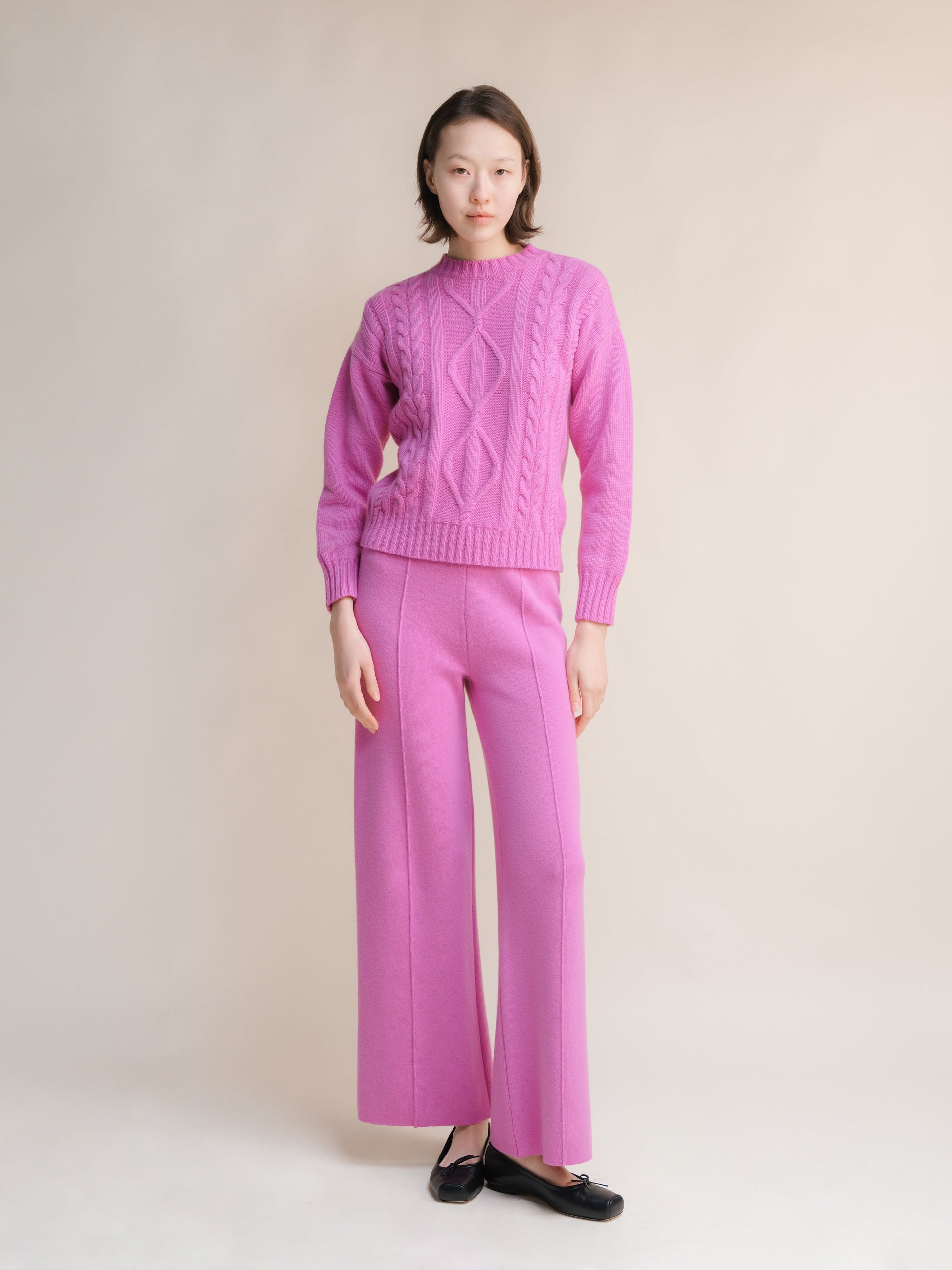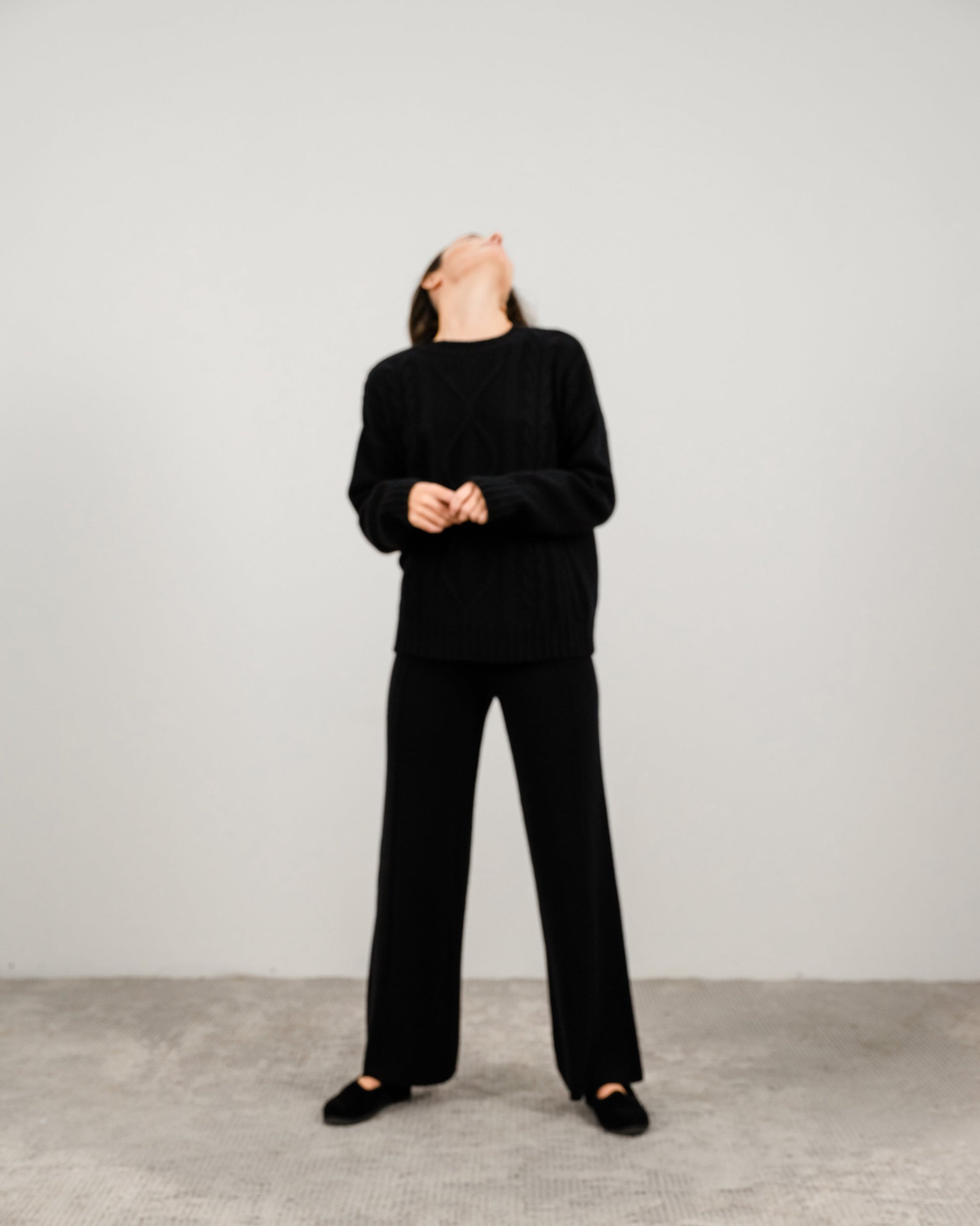 Details – Cable knit body – Plain knit sleeves – Oversized ribbed neckline, hem, and cuffs – 40% wool, 30% viscose, 20% polyamide, 10% cashmere – Entirely made in Italy