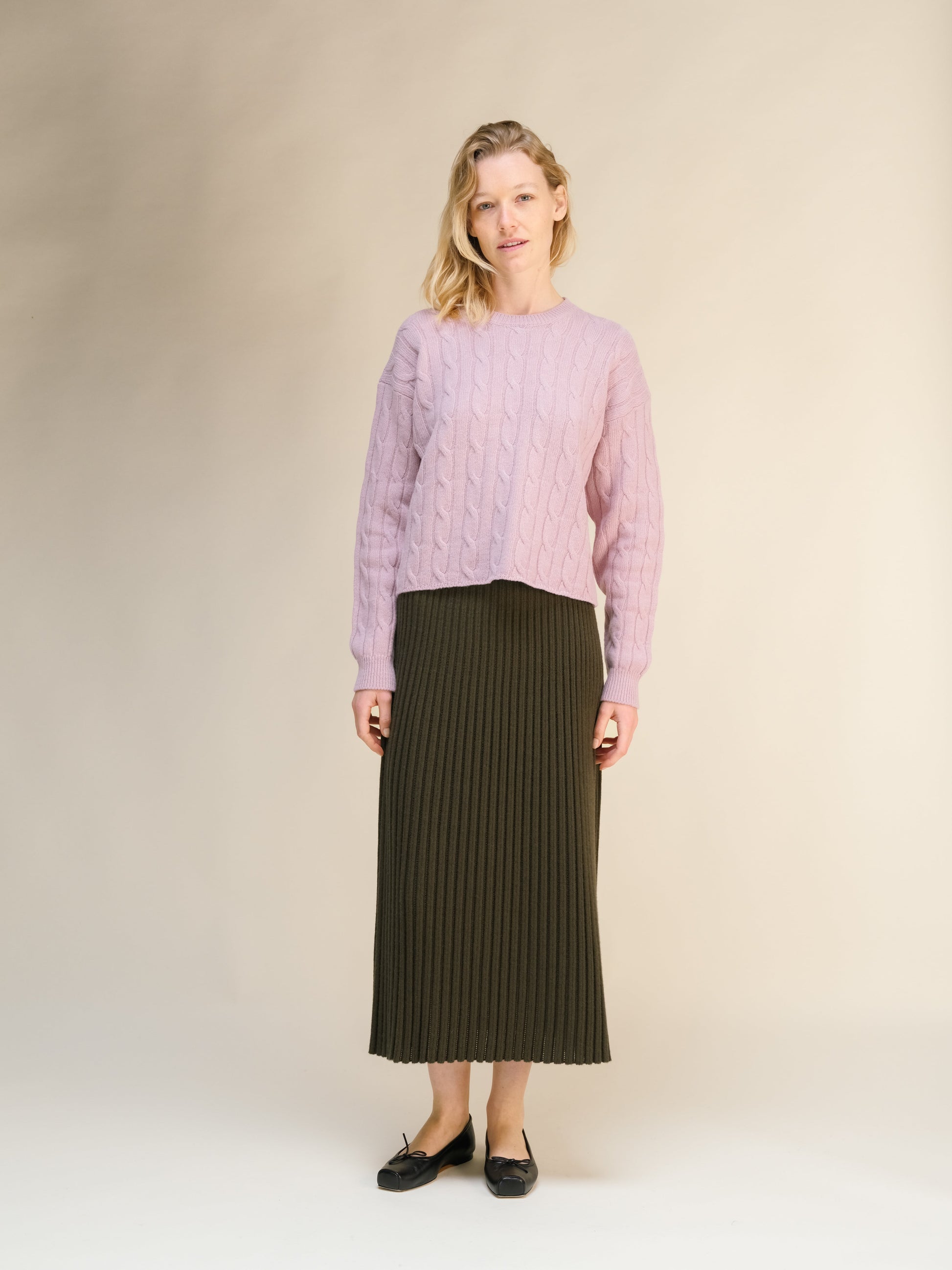 A cropped crewneck crafted in our warm and soft 3-ply cashmere mix. The cable-knit design and ribbed trims add texture and refinement. Easy to style with trousers or denim, it offers a relaxed silhouette with a modern touch.