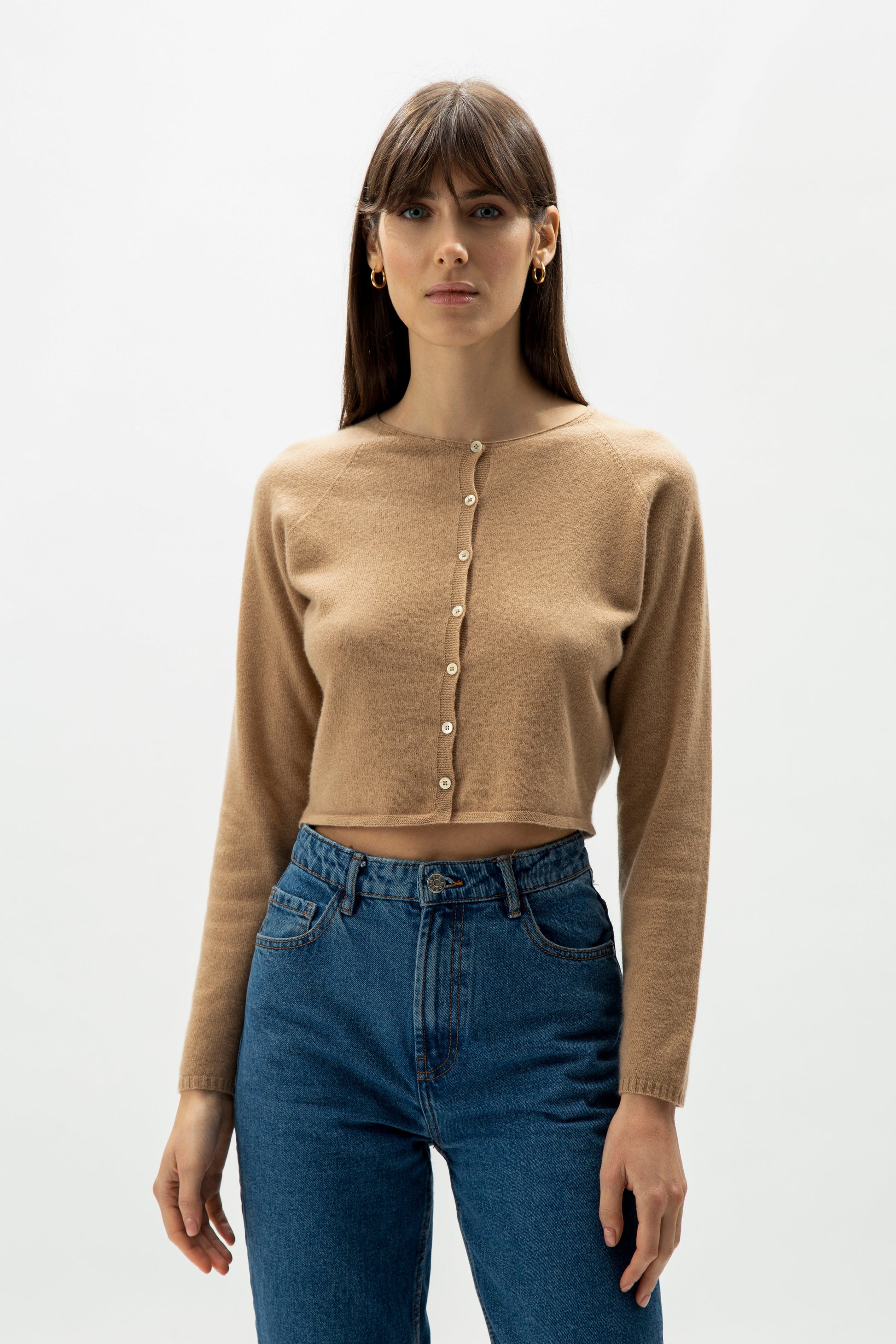 An easy-to-style piece with effortless elegance. This cropped cardigan is crafted in our soft cashmere mix, featuring a plain knit body, raglan sleeves, and refined ribbed finishes. Mother-of-pearl buttons add a subtle touch of luxury and underline the quality of this essential piece.