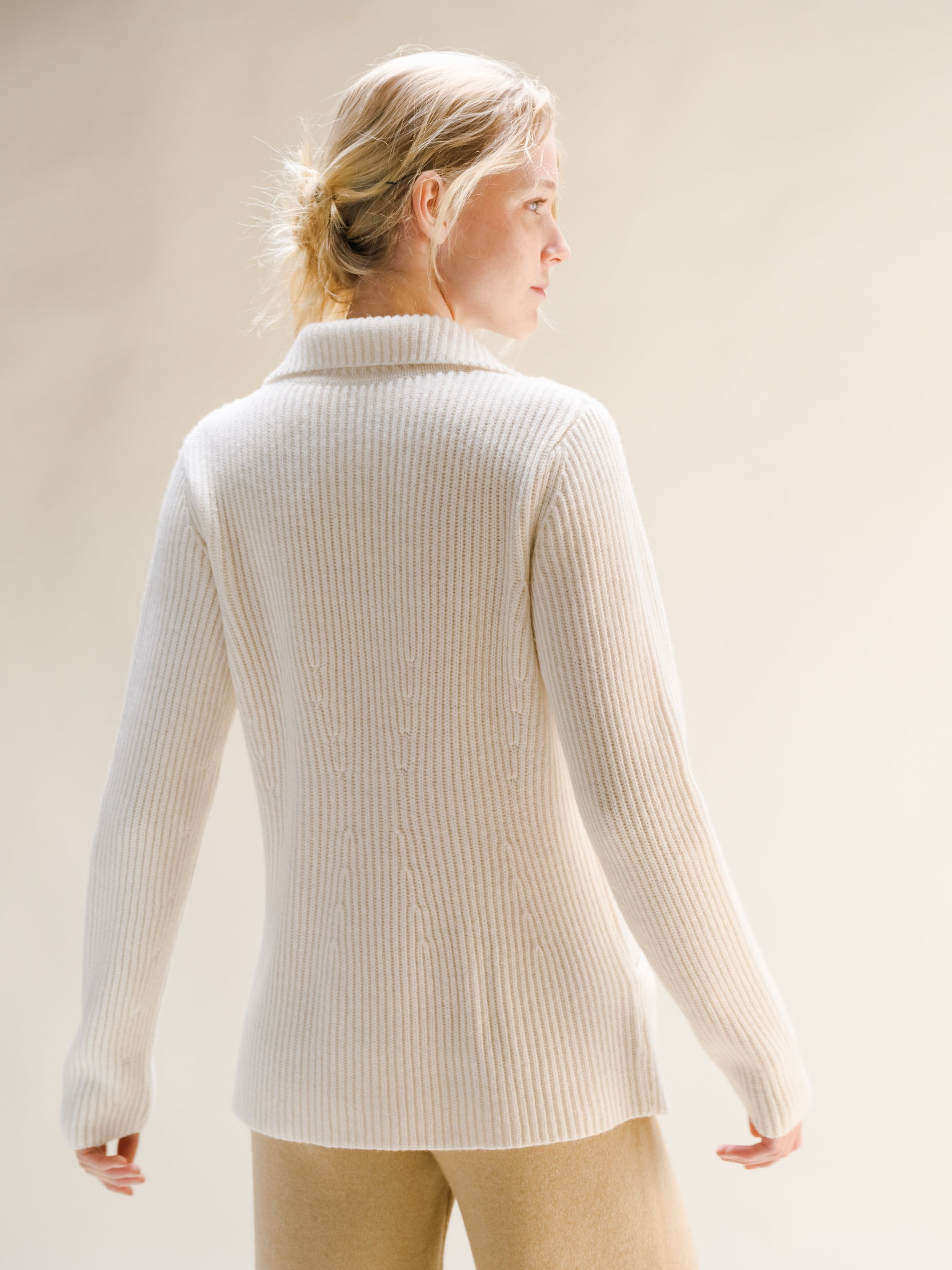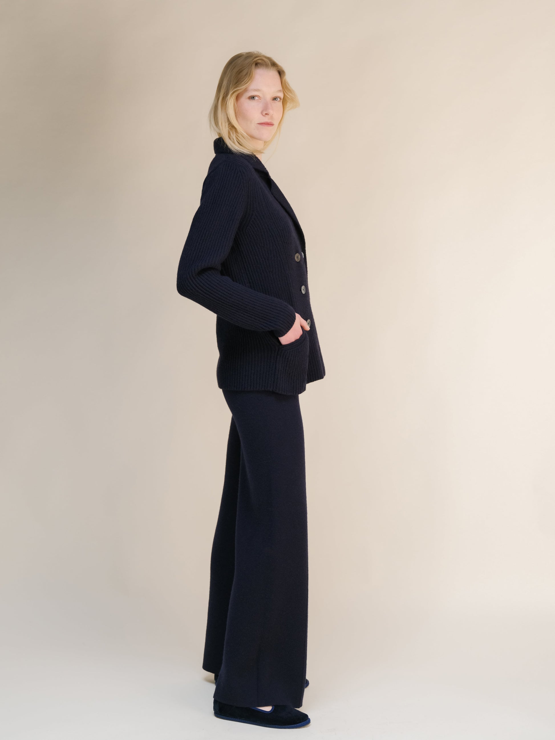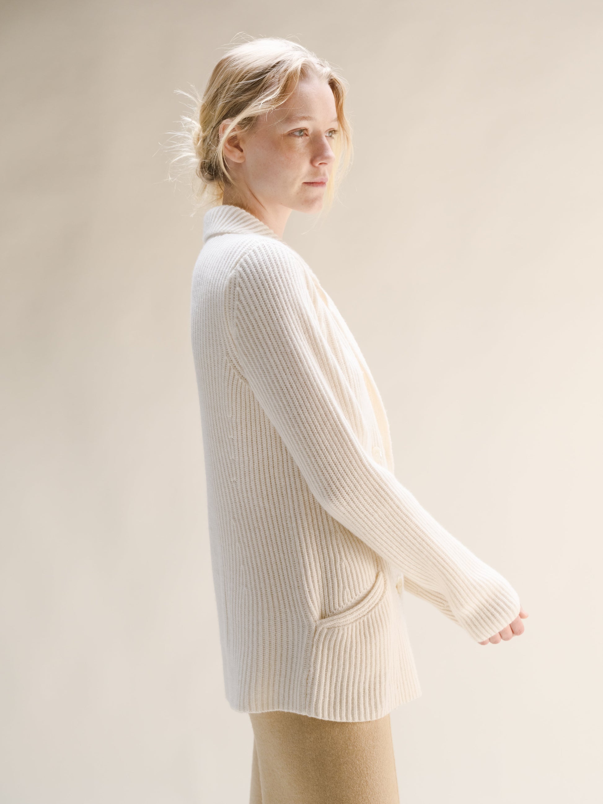 Double-breasted knit jacket with a relaxed fit. Crafted in a soft ribbed texture, it features a timeless design with tailored knitwear details. The collar, lapels, mother-of-pearl buttons, and functional pockets add uniqueness to its silhouette. A refined essential for a modern wardrobe.