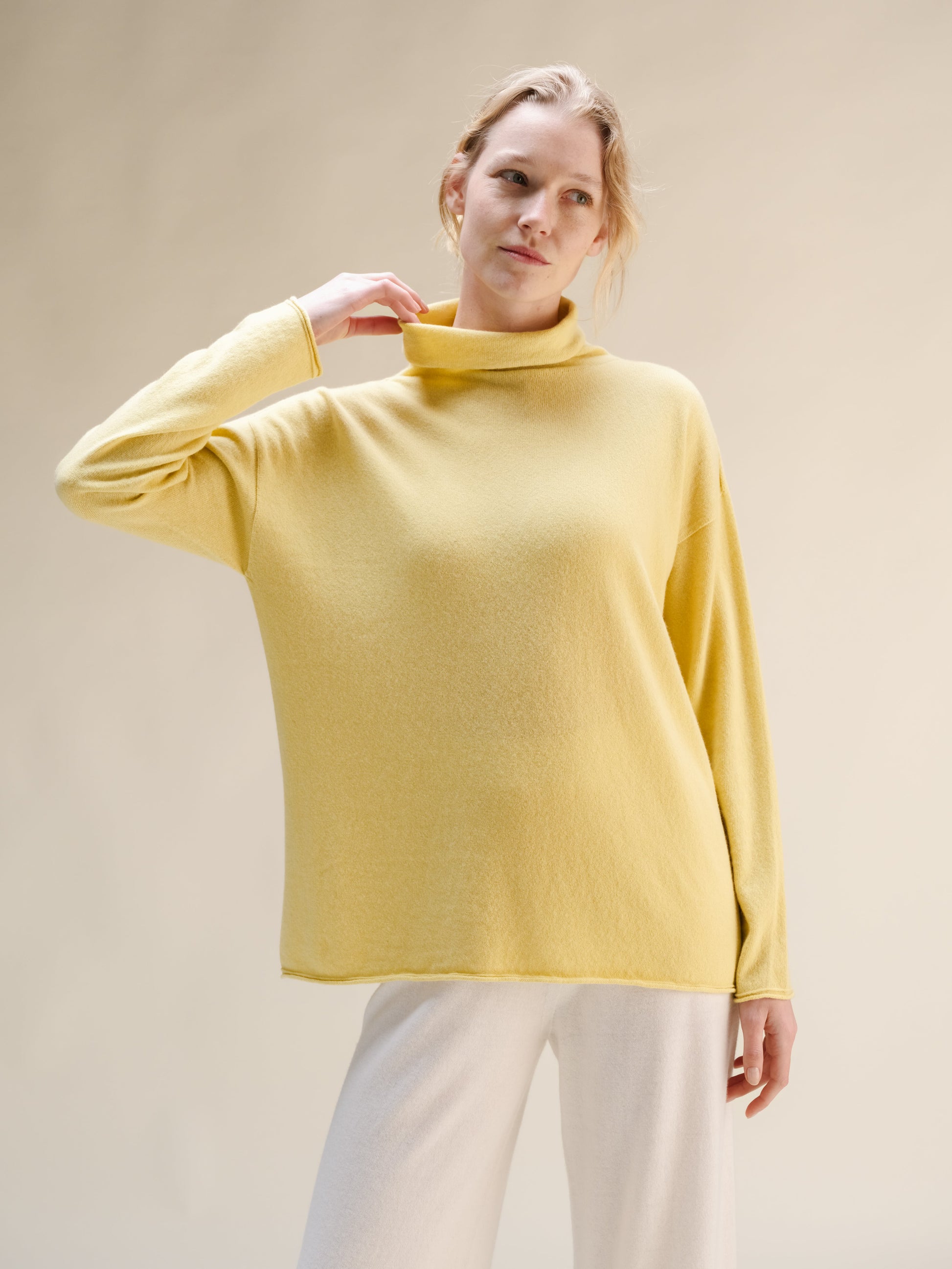 A wardrobe essential, perfect for layering in every season. With a relaxed fit and high neckline, it offers breathable comfort and a cozy silhouette for everyday wear. Pair it with our Cashmere Mix Wide-Legged Light Pants for a coordinated look.