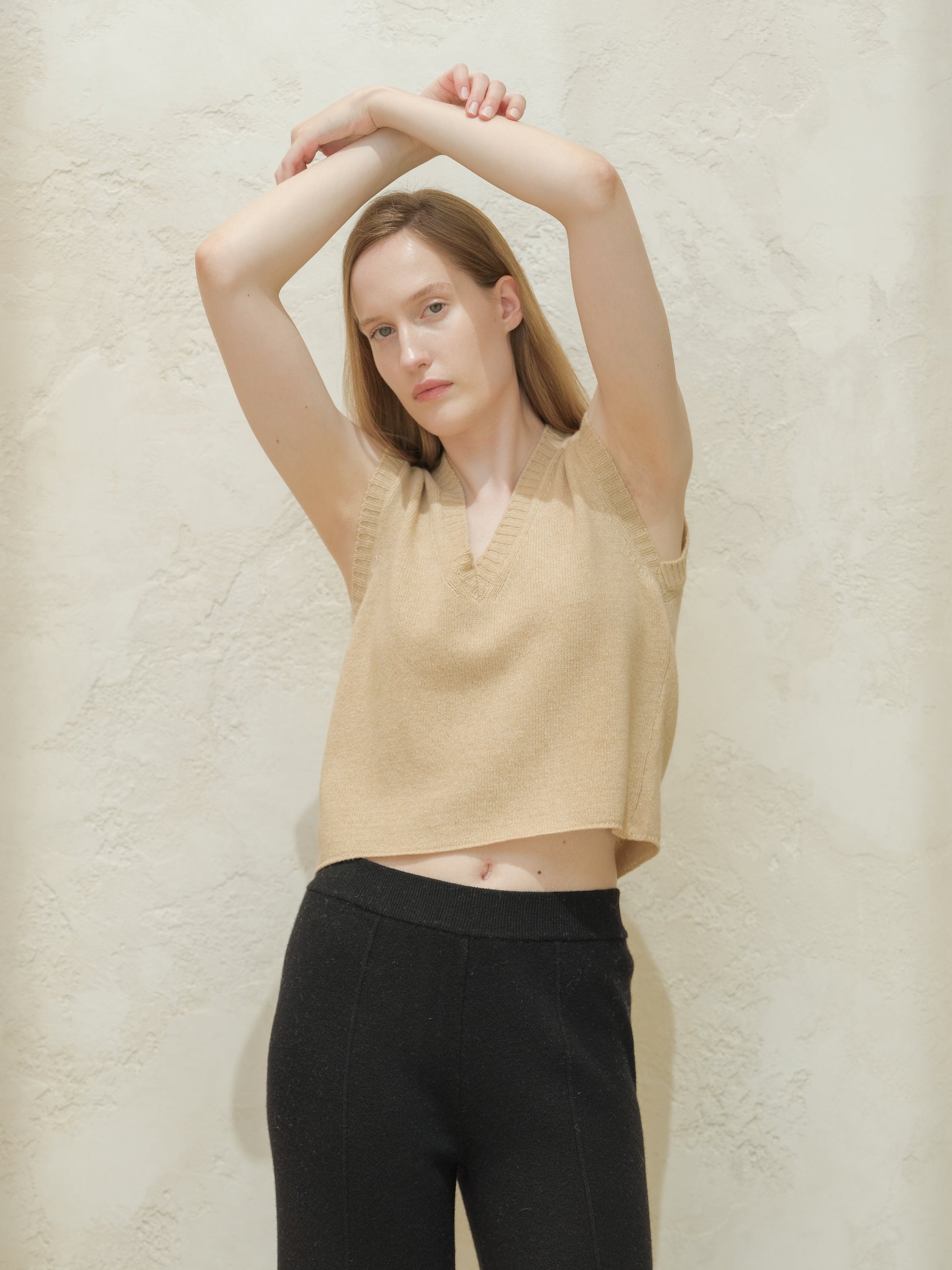 This sleeveless top in soft cashmere mix features a defined V-neckline and ribbed trims that enhance its minimal silhouette.