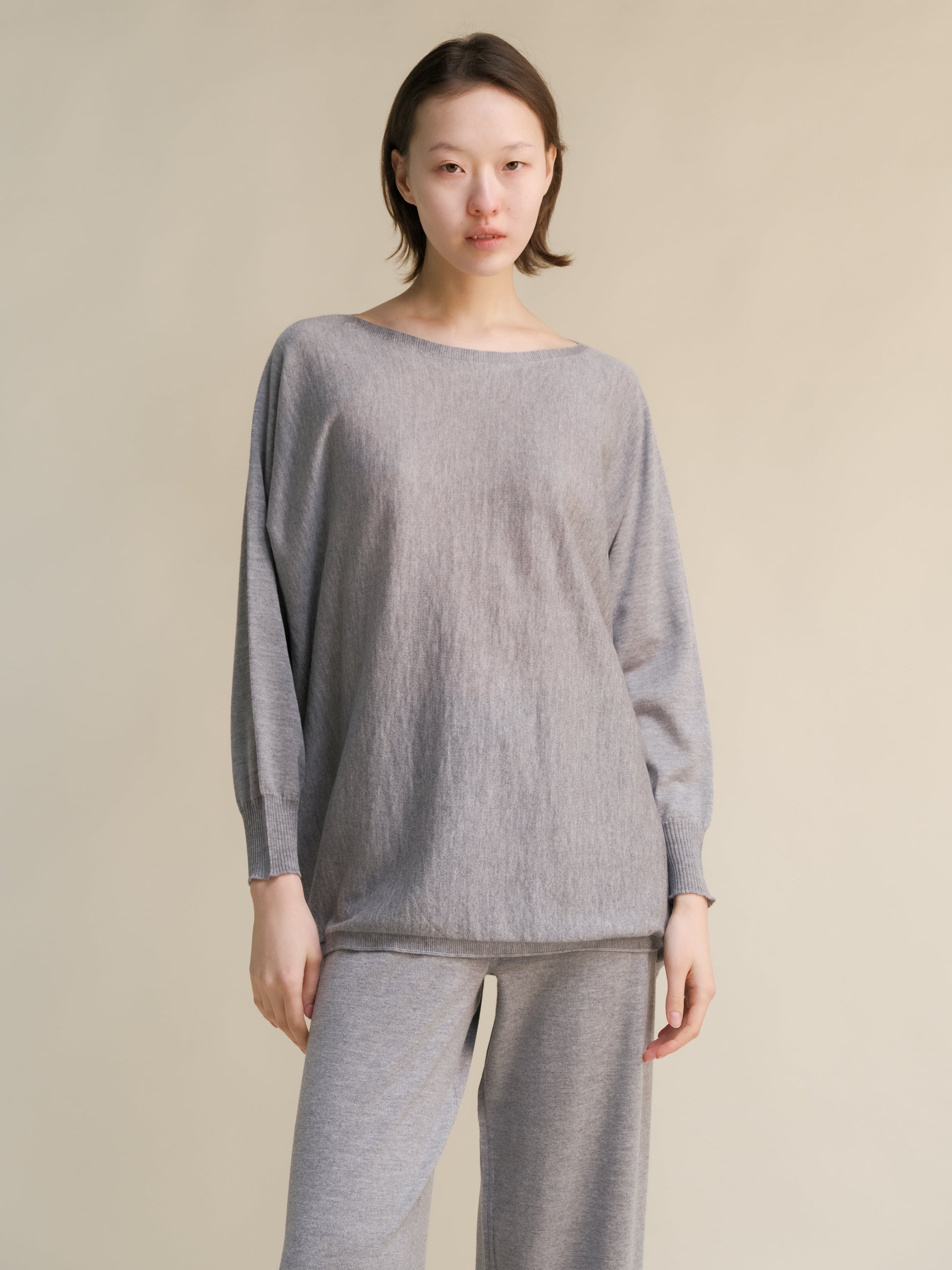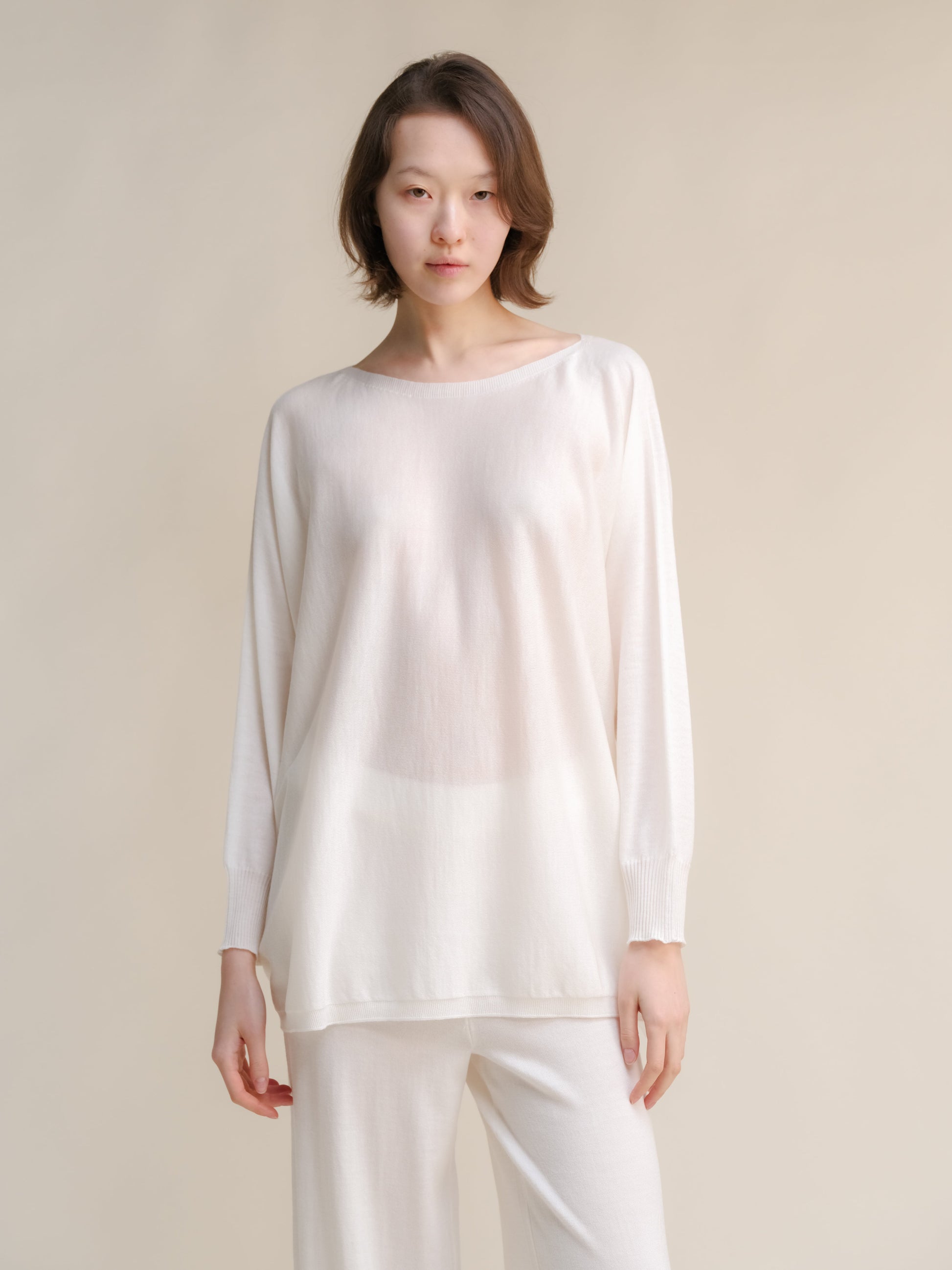 This oversized boat neck sweater is seamlessly knitted in 100% extrafine merino wool (Cashwool®).