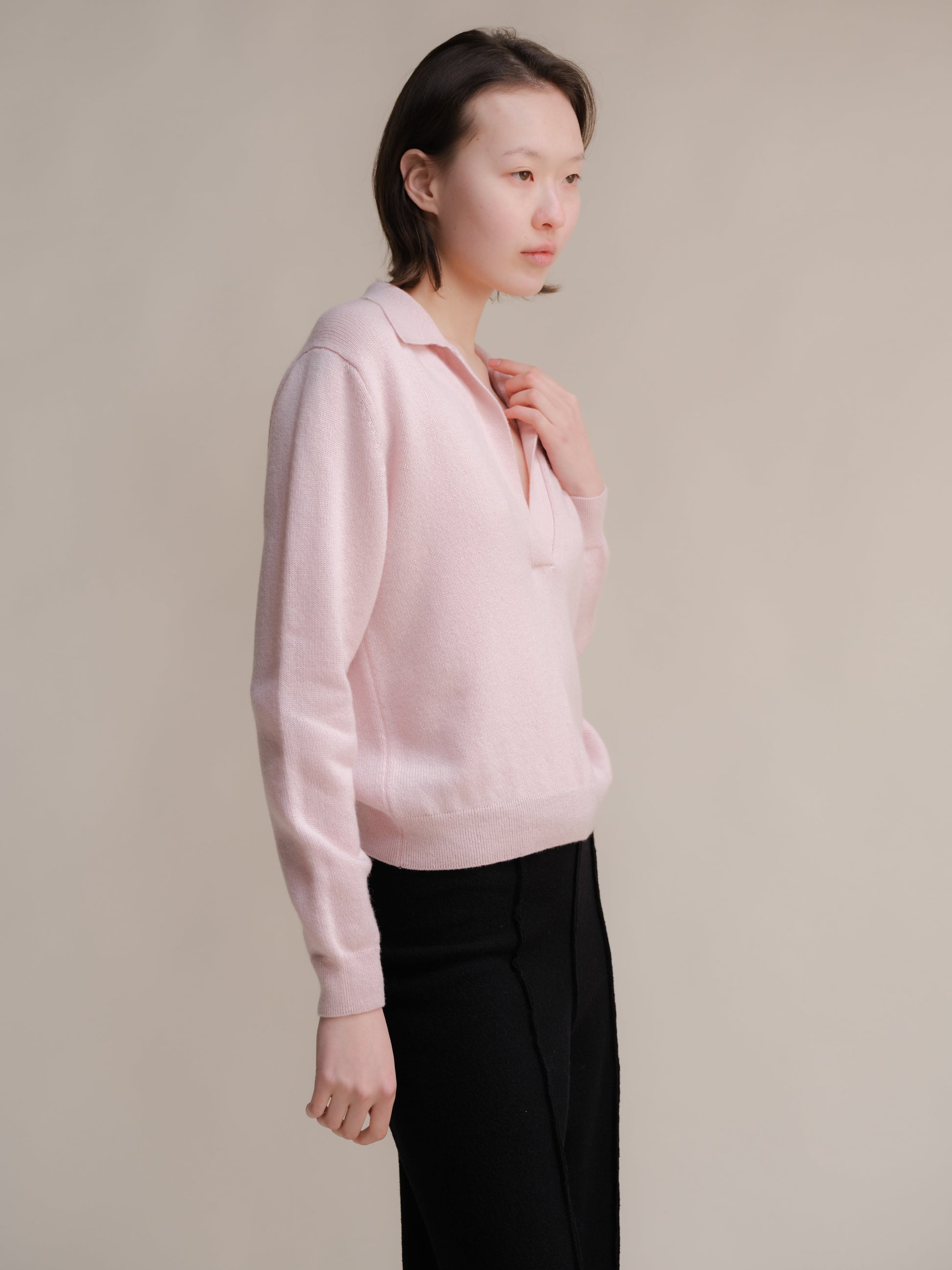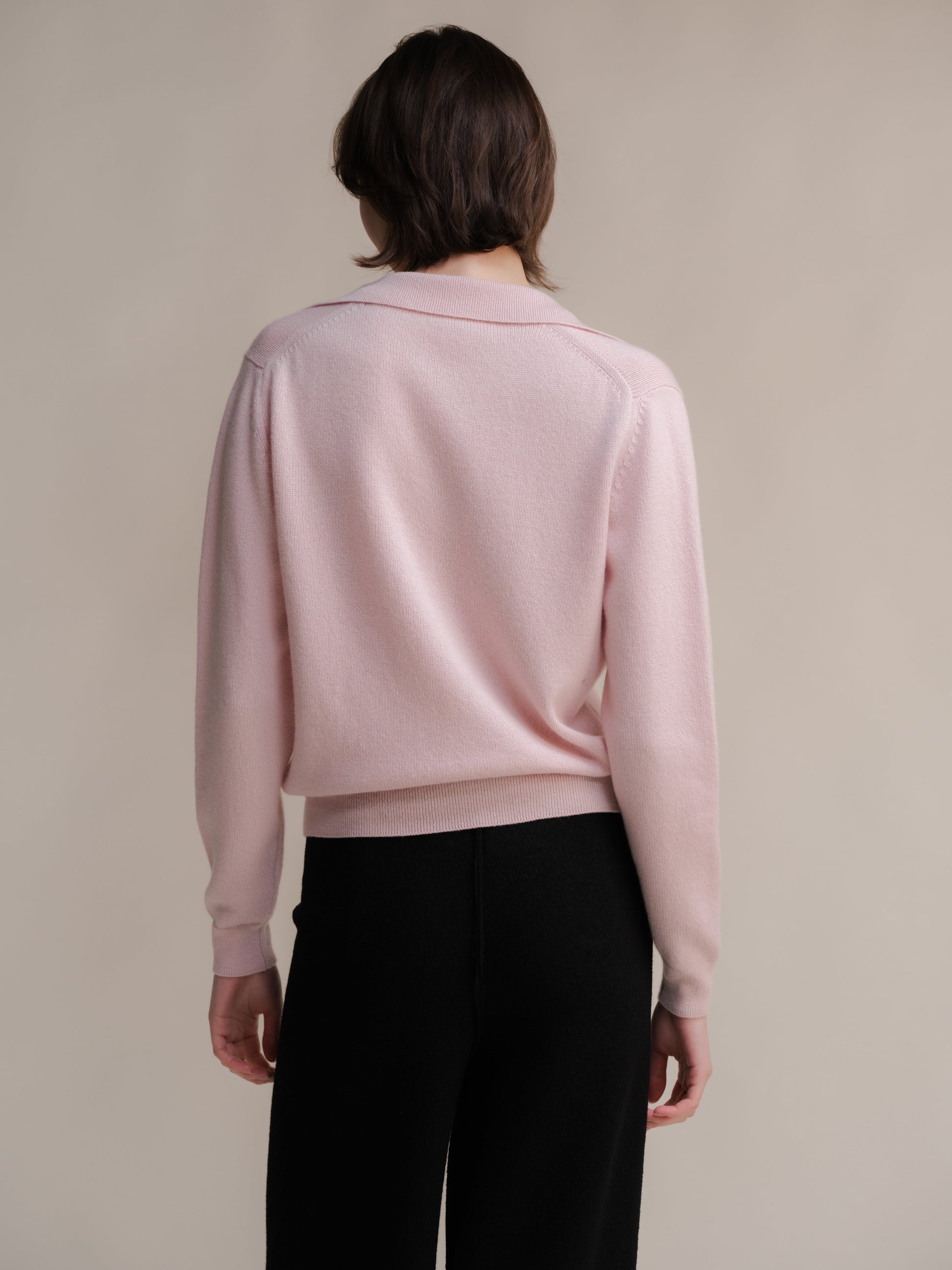 Long-sleeve polo in pure cashmere. Soft and lightweight, featuring a deep buttonless neckline.